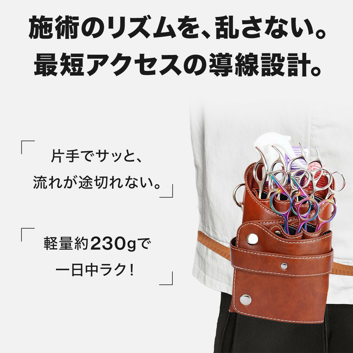 《商品概要》 初めてのシザーケース選びでお悩みの方へ シザーケースは、毎日の施術を支える大切な仕事道具のひとつ。 だからこそ、機能性とデザイン性の両立が求められます。 本製品は、使いやすさ・清潔さ・収納力を兼ね備えたシザーケースです。 【快適な施術をサポートする機能的設計】 どんなスタイルにも自然に溶け込む、シンプルで洗練されたデザイン。 シザーやツールがすぐに取り出せる構造で、施術の流れを妨げず...