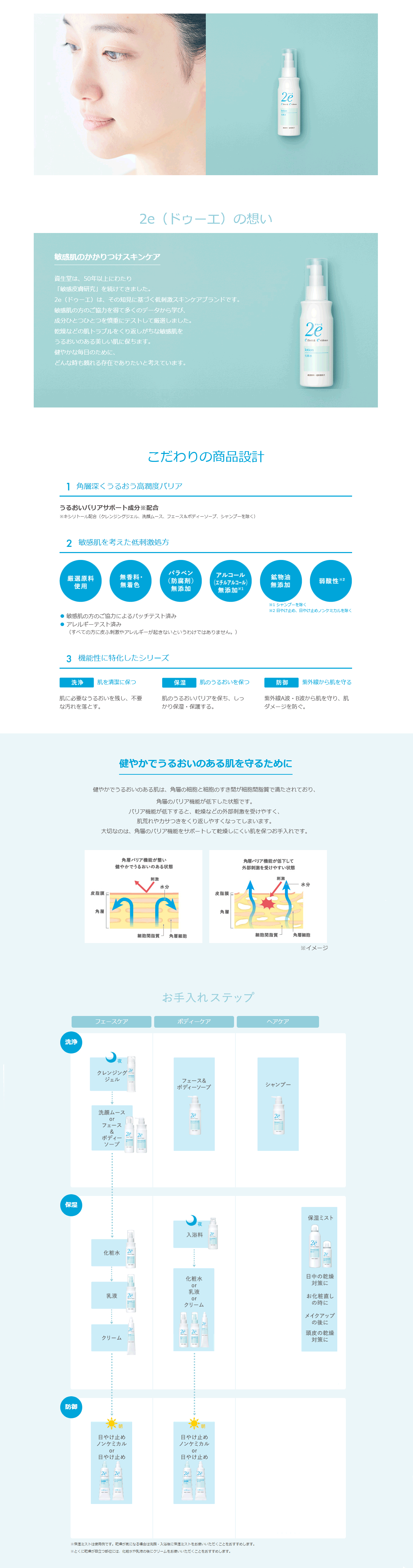【2e ドゥーエ ひやけ止めSPF45,PA+++】 紫外線吸収剤無配合。紫外線散乱剤を均一に分散させ、高い紫外線防御効果を実現。 使用方法 ・肌を清潔にし、うるおいを補給した後、指先に日やけ止めを適量取り、顔の5カ所(両ほお・額・鼻・あご)におきます。 ・顔のすみずみまでムラなくやさしくなじませ、その後、同量を重ねづけします。 ・お化粧をする場合は、一度ぬりの後にファンデーションなどをつけてくだ...